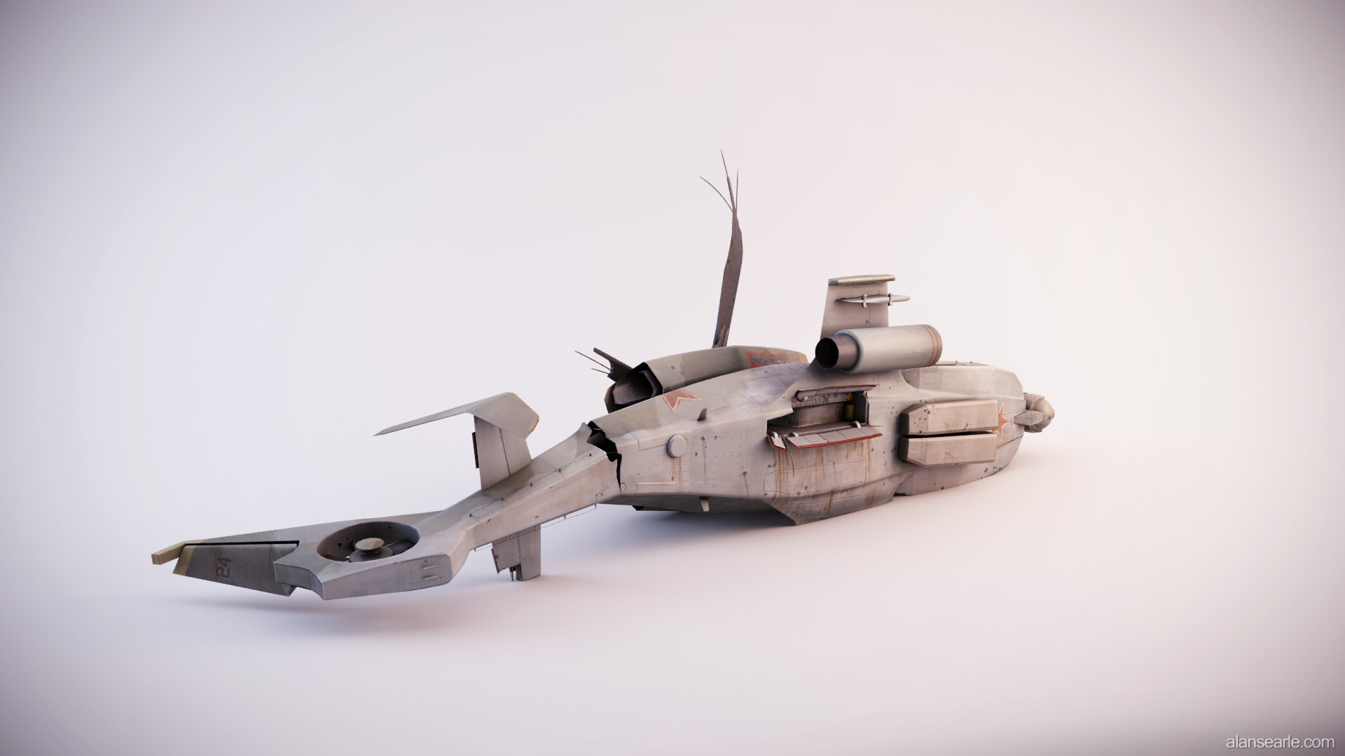 This model was a feature piece of cover in the PS3 first person shooter "No Man's Land", found within PlayStation©Home. Due to the design of the game, the helicopter had to have fairly flat vertical surfaces to hide behind, which is one of the reasons it is lying on its side. Many different attack helicopters were used as inspiration, however the primary shape is a mix between the RAH-66 Comanche Stealth Helicopter and the AH-64 Apache.